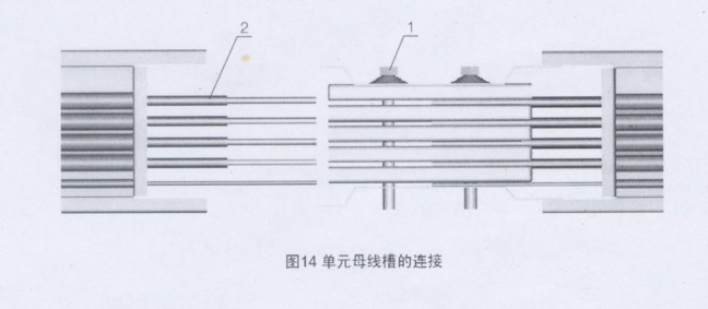 先取出序號(hào)1連接螺栓,然后將序號(hào)2母線槽插入,再穿上序號(hào)1連接螺栓,墊入碟形墊圈,用扭力板手將螺母擰緊(扭趴不小于6ONm),然后裝上蓋板(見圖),擰緊接頭螺栓足母線槽連接的保證。緊固后的接頭檢查要求用0.1mm的塞尺不能插進(jìn)。