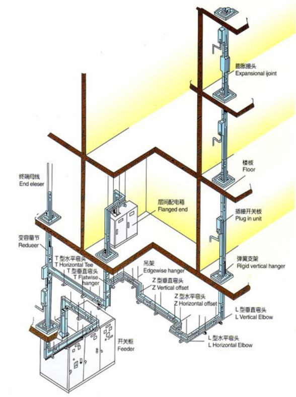 母線槽變向節(jié)(彎頭)、用于水平或重直裝置時(shí)配電母線的銜接及改變母線的走向。直母線單元。與母線槽變向節(jié)配合,用于將電源接送至用電設(shè)備。插接箱,用于由母線上引出電源分路。