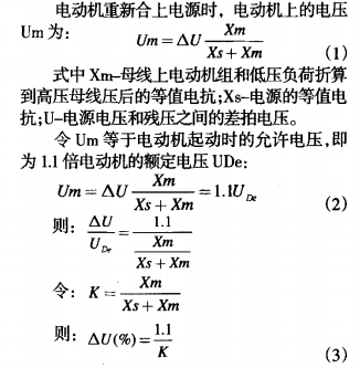 圖1所示為母線槽系統(tǒng)的某一段接線圖,圖2為電動機切換時的等值電路圖。圖中Us-電源電壓;Ud-母線槽上電動機的殘壓;Xs-電源等值電抗;Xm-母線槽上電動機組和低壓負載的等值電抗(折算到高壓母線槽壓);AU-電源電壓與殘壓之間的差拍電壓。