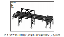 3載荷,捆綁的模仿定義重力加速度9800mm/s2,在支架立柱底端及其他相應方位施加捆綁。如圖2所示,為定義重力加速度,捆綁后的ANSYS仿真圖。